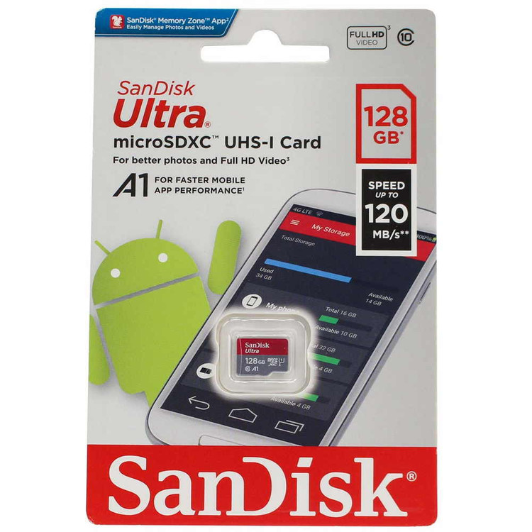 کارت حافظه microSDXC سن دیسک مدل Ultra A1 کلاس 10 استاندارد UHS-I سرعت 120MBps ظرفیت 128 گیگابایت
