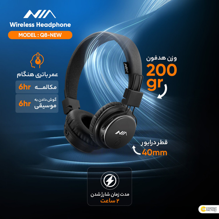 هدستهای بلوتوثی معمولا قیمت بالایی دارند و به همین دلیل افراد برای کاربری عمومی به سراغ آنها نمیروند. اما هدفون بلوتوثی نیا به عنوان یک محصول میان رده، قیمت بسیار مناسبی دارد و در عین حال هم امکانات صوتی ویژهای را در اختیار شما قرار میدهد. علاوه بر اتصال با بلوتوث به گوشی موبایل، شما میتوانید کارت حافظه حاوی فایلهای موسیقی را به صورت مستقیم درون شیار حافظه هدفون قرار دهید و به این آهنگها گوش کنید. همچنین هدفون مدل Q8-NEW قابلیت پخش برنامههای رادیویی را هم دارد. بدنه هدفون بلوتوثی نیا مستحکم است و مقاومت خوبی دارد. هدفون نیا با درایورهای 40 میلیمتری، برای نوجوانان و کودکانی که قصد بازی در گوشی با صدای بلند را دارند یا میخواهند به موسیقی موردنظر خود گوش کنند، بسیار مناسب است. این هدفون در مدت زمان 2 ساعت به طور کامل شارژ شده و تا 5 ساعت میتوانید از آن استفاده کنید.