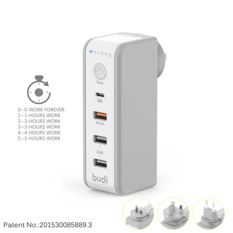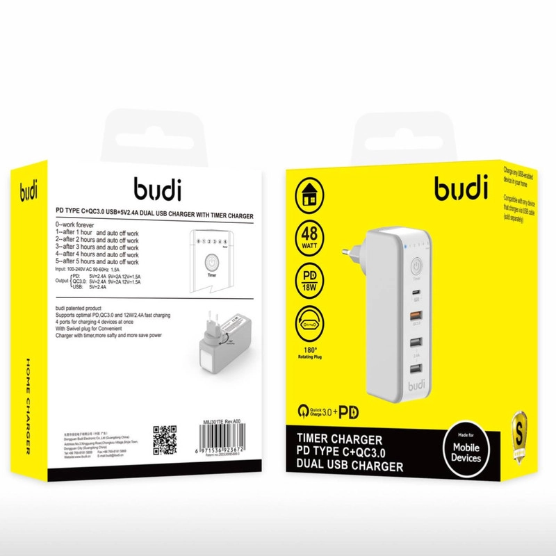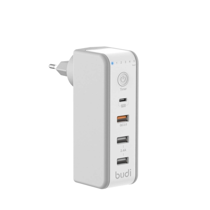 شارژر دیواری محصول شرکت بودی BUDI مدل M8J301TE دستگاههای شما را شارژ میکند و دارای سه درگاه خروجی USB و یک درگاه خروجی PD است. از دو درگاه خروجی آن مجموعا میتوان 2٫4 آمپر شدت جریان خروجی گرفت بطوری که از یکی از درگاه ها 2٫4 آمپر و بطور هم زمان از هر دو درگاه USB شدت جریان 1٫2 آمپر و درگاه سوم با قابلیت فست شارژ و خروجی PD است و همچنین دارای تایمر داخلی با قابلیت تنظیم مدت زمان شارژ برای حفاظت از عدم ماندگاری طولانی مدت دستگاه ها در شارژ است و پس از تنظیم زمان مورد نیاز به صورت اتوماتیک خروجی شارژر را قطع می کند؛ بنابراین علاوه بر اینکه امکان شارژ باتری گوشیهای موبایل را دارید میتوانید تبلتهای خود را هم شارژ کنید. از قابلیت های جالب این شارژر امکان چرخش دوشاخه آن است.